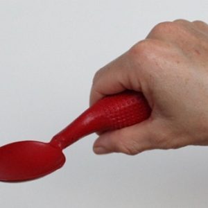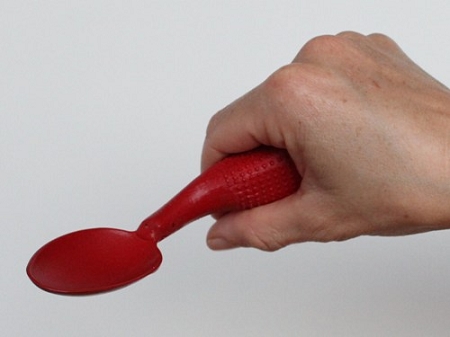 Adaptive eating utensils, designed by occupational therapists, unique angle maximizes hand function.